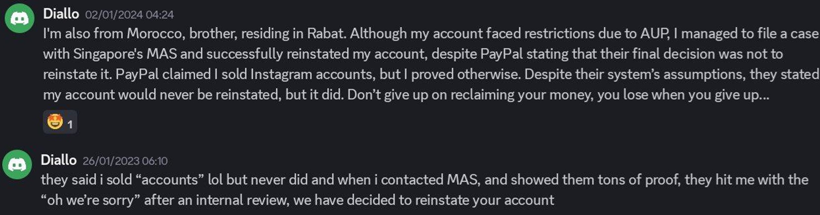 In this Discord exchange, a user from Morocco, residing in Rabat, explains that PayPal restricted the account under an AUP-related theory and allegedly claimed he had sold Instagram accounts. He says he gathered proof showing that allegation was wrong and escalated the matter to Singapore's MAS.
