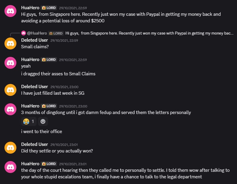 Here, a user from Singapore says he recovered his money and avoided a potential loss of around $2,500 after taking the matter to small claims. He describes months of back-and-forth, then personally serving letters at PayPal's office before the case reached the hearing stage.