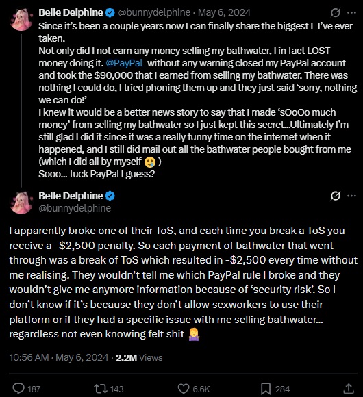 In 2019, internet personality Belle Delphine had her PayPal account closed without warning and $90,377.58 USD taken, earned from selling her merchandise. In 2024 she tweeted about it and PayPal released her money only after Business Insider and other outlets contacted PayPal for comment.