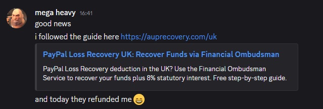 A Discord user shared good news after following the UK guide on this site: PayPal refunded their funds. Short, simple, and exactly what the guide is for.